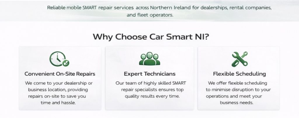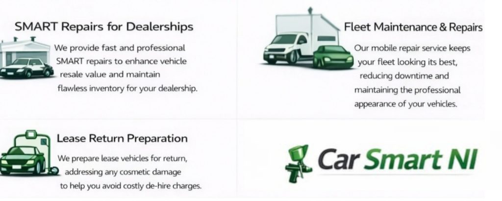 Home Services Dealers/Fleet About Gallery Contact Get a Quote Dealer and Fleet Services Tailored SMART Repair Solutions for Dealerships and Fleet Operators Reliable mobile SMART repair services across Northern Ireland for the public, dealerships, rental companies, and fleet operations.